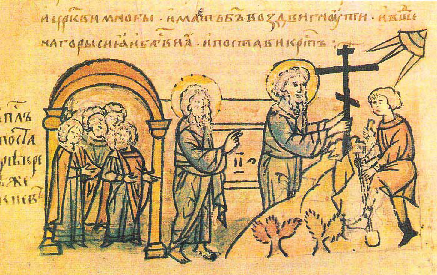 Saint Andrew erecting the cross on the hills of the Dnieper River; a prophecy of the city of Kyiv (15th century) | Creative Commons, courtesy Wikimedia. This is from the Radziwiłł Letopis, also known as the Königsberg Chronicle, which is an Old East Slavic illuminated manuscript from the 15th-century; it is believed to be a copy of a 13th-century original.