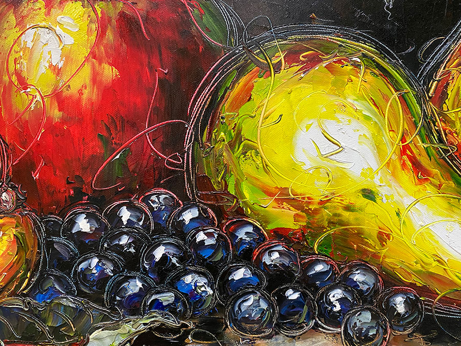 Detail from October Harvest, Van Matino (contemporary) | Image from Art Leaders Gallery. When I first saw this detail crop of the larger painting, I honestly couldn’t figure out what it was at first – the glowing pear on the right was so lustrous that I thought it was an abstract painting. The richness of the colors in the fruit is a nice analogy for what God must see in us – our shining souls – rather than how we picture ourselves.