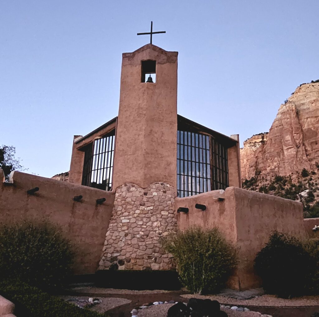 This Sunday, we had the blessing of celebrating Mass with the Benedictine monks at the Monastery of Christ in the Desert. Their chapel is small but beautiful – a mix of adobe, wood, and glass windows that start some 15 feet above the tabernacle and soar another 15 feet up, showcasing the red canyon walls just outside the chapel. Their impressive acreage borders the Chamma River in northern New Mexico, and, 13 miles down the dirt road you must take to reach the monastery, it opens up into what I call a mini Zion National Park. The natural beauty here steals your breath – especially since we’re here the last week in October and the brilliant yellow leaves of the hardwoods contrast with the dark green pine and juniper as well as the sage green of sagebrush and chama cactus. The monks tend a large flock of chickens, a modest herd of sheep, hundreds of honeybees, and a friendly working donkey. They also grow vegetables and carry out a number of other labors. They only have 15 brothers here, which is a shame, because both the working life and the prayer life in this treasure of a monastery are thriving.