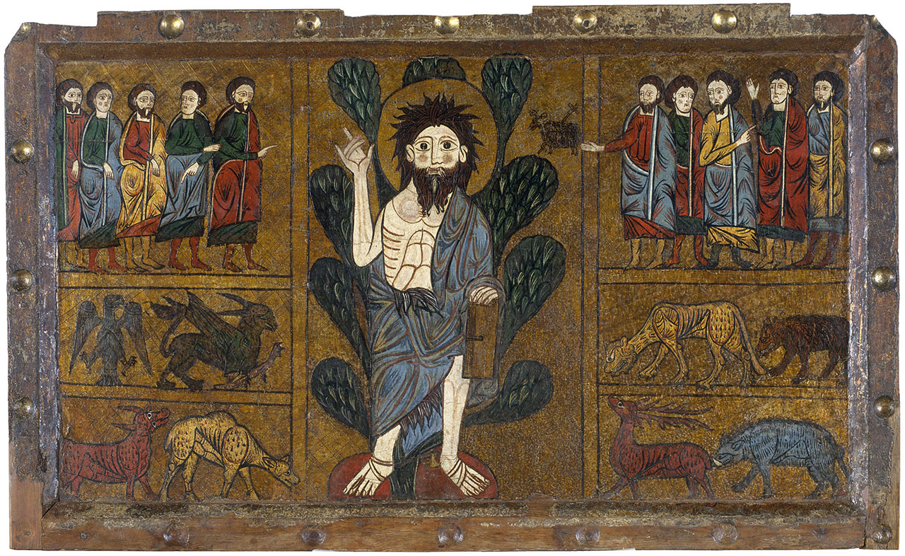 Altar Frontal from Gésera, Spain (1200s) depicting John the Baptist preaching in the desert, surrounded by wild animals | Image from Museu Nacional d’Art de Catalunya, Barcelona.