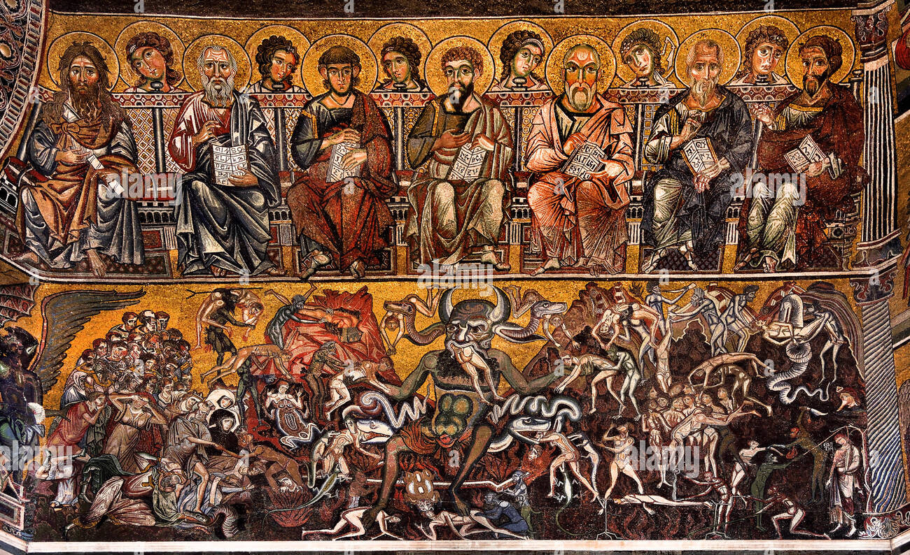 Christ and the Last Judgement, mosaic in Saint John Baptistery in Florence, Italy (1260-75) | Image is a preview download from Alamy.com. Here we have the fuller composition of the image at the top of this reflection (apologies for the watermarks). Note that the damned in hell are presided over by the council of prophets and angels – in particular, note the wild-haired St. John the Baptist on the far left. This is a good reminder of our doctrine: hell is a sentence that is passed on those who have not “born good fruit” in life and accepted God; it is just and ordered, promised from the beginning. Unlike popular culture conceptions of good and evil fighting it out in an almost-equal battle (think of Star Wars), we condemn that heresy as dualism. Evil and Satan certainly exist, but they serve as part of the crucible of perfecting ourselves in this life and then as the jailers of hell in the afterlife. God has no equal and Jesus has already defeated death and Satan. The other important aspect of this mosaic is that it shows the deep medieval understanding of the important truths of the faith that are inaugurated with baptism. This magnificent Battistero di San Giovanni reveals to the initiates on the inside of its walls in glorious fashion the mysteries of our faith, including the fact that they are being baptized with the Holy Spirit and fire. They are being brought into the faith that promises a Final Judgement by fire from the very beginning.