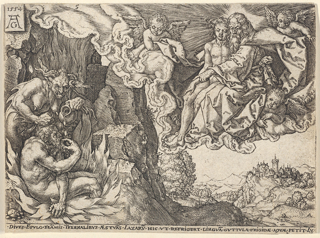 The Rich Man in Hell, Seeing Lazarus Embraced by Abraham, from The Parable of the Rich Man and Lazarus (1554), Heinrich Aldegrever | Creative Commons, courtesy the Metropolitan Museum of Art.